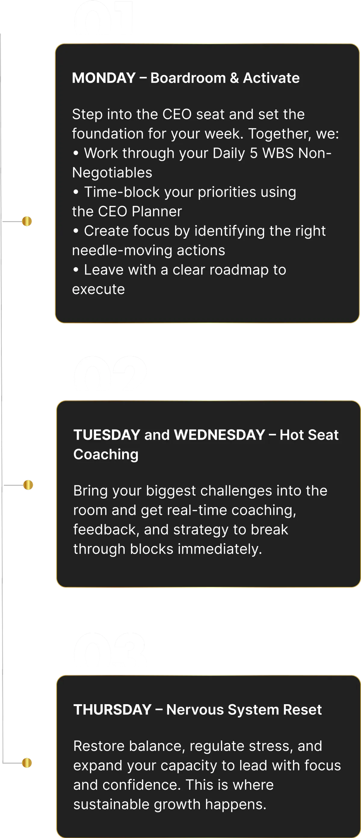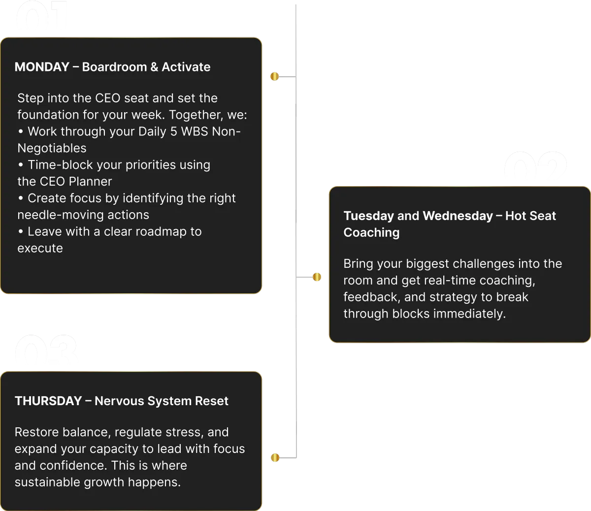Your growth isn’t random - it’s built on rhythm. Inside WBS, your week is structured to create focus, results, and momentum.