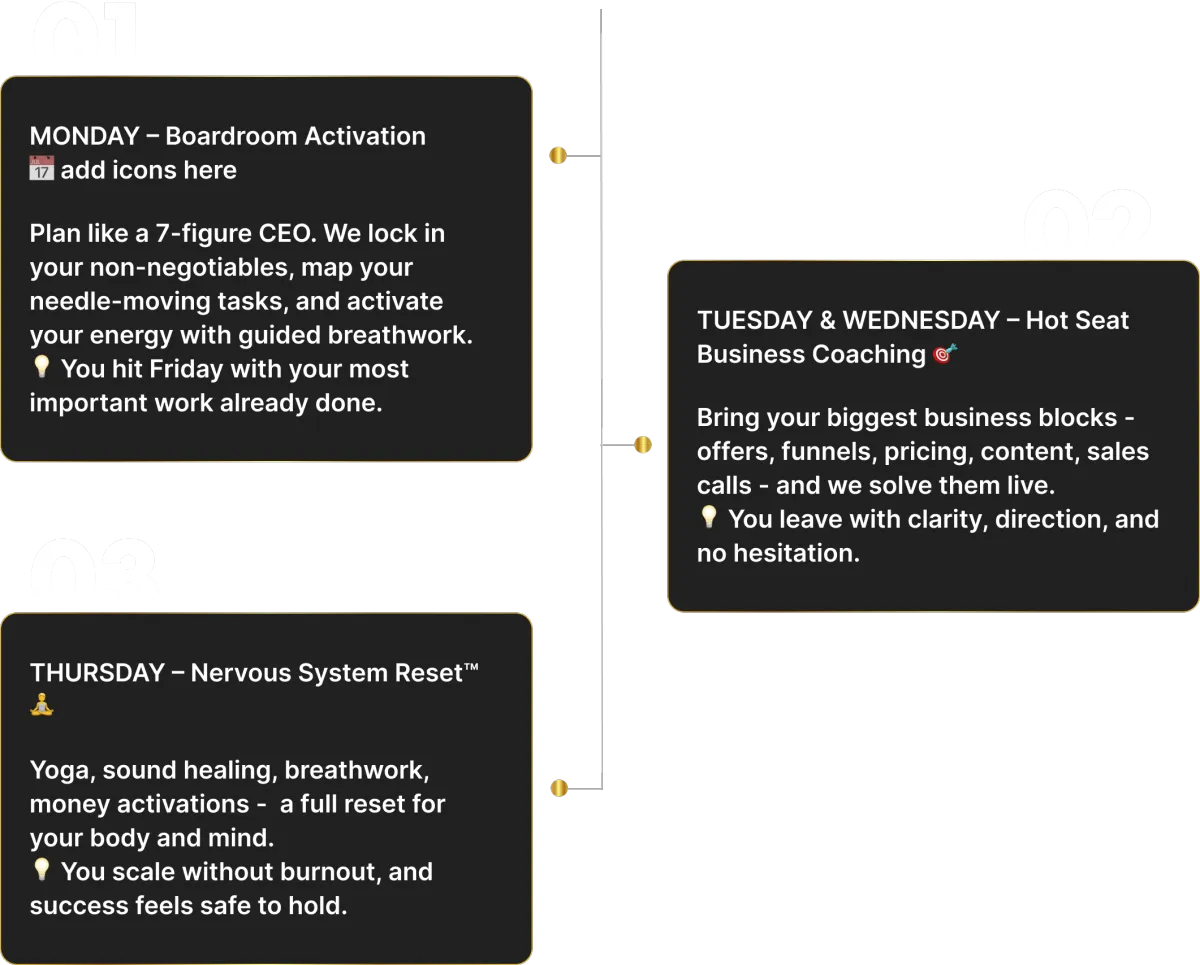 Your growth isn’t random - it’s built on rhythm. Inside WBS, your week is structured to create focus, results, and momentum.