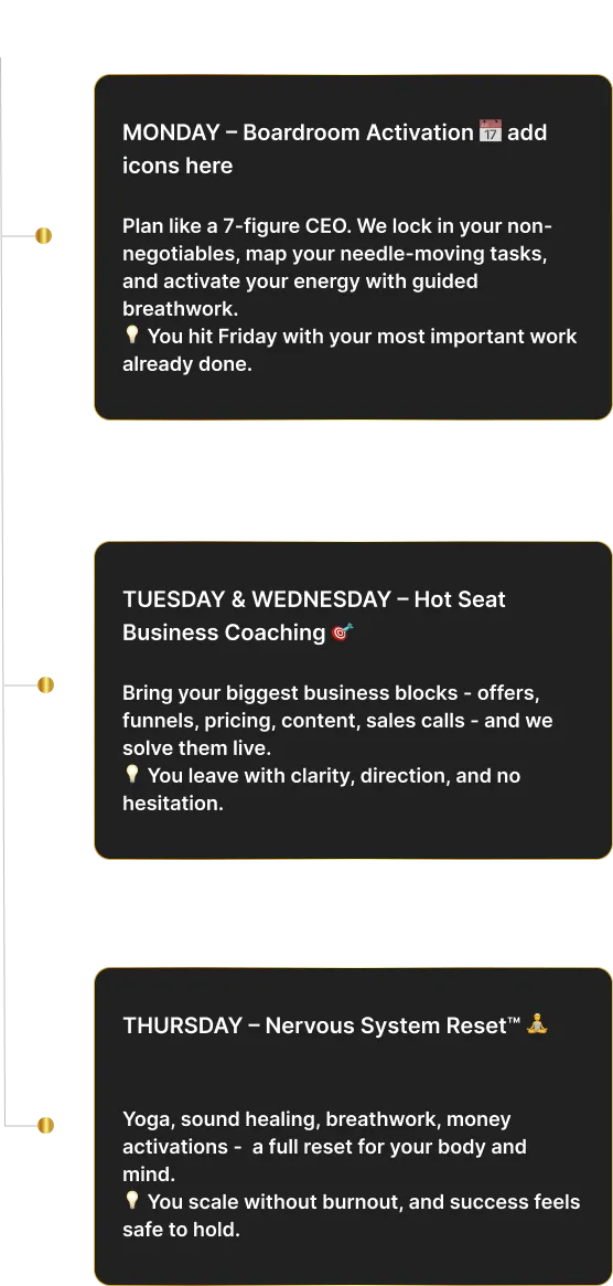 If you attend the weekly sessions, complete the activations, and engage in the community — and you don’t feel your business and mindset are moving forward within 90 days — we’ll work with you until you do.
